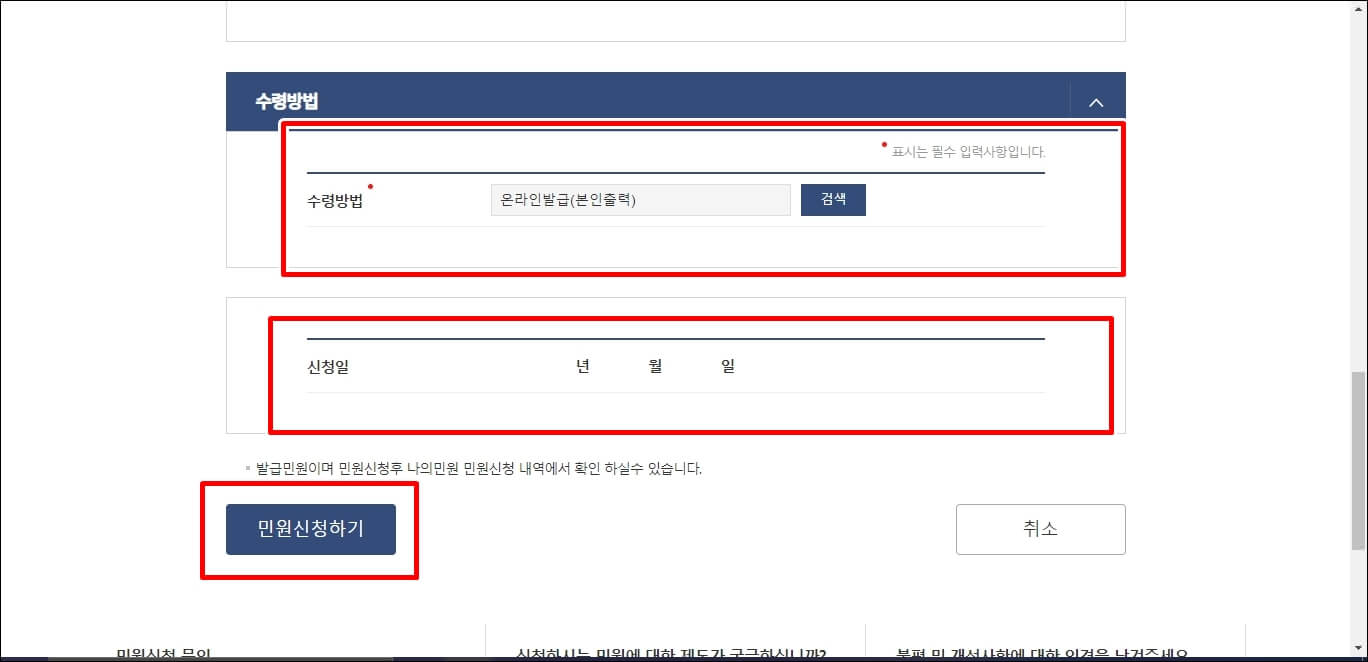 마지막으로 수령 방법을 선택하시고 민원 신청하기를 누르시면 되는데요...