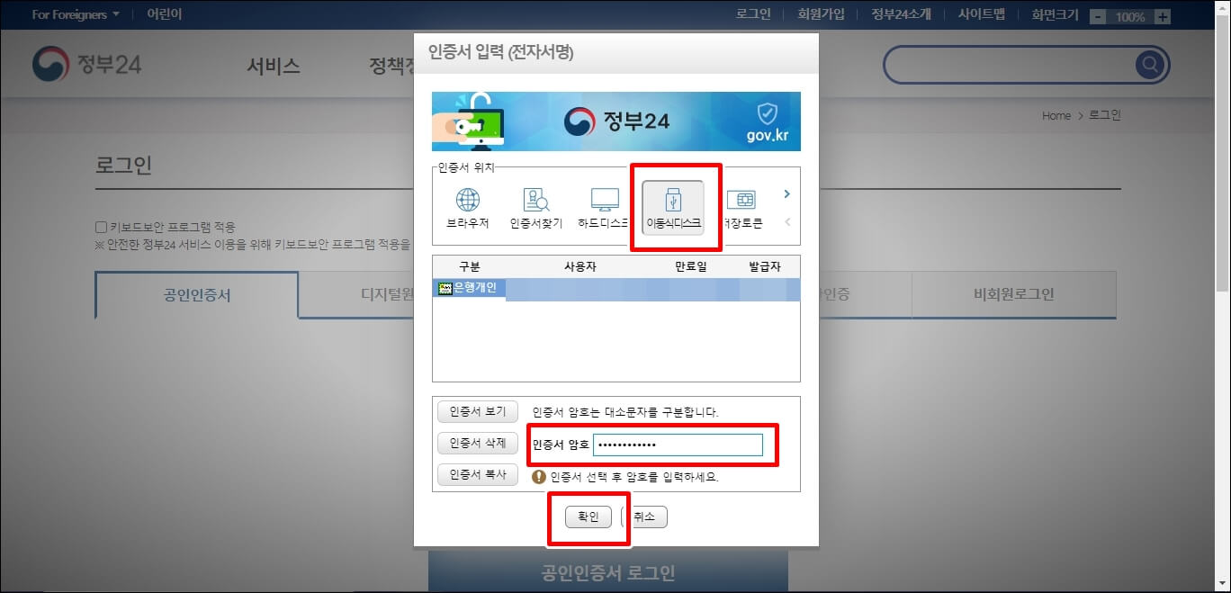 인증서 암호를 입력하시고 확인을 클릭합니다.