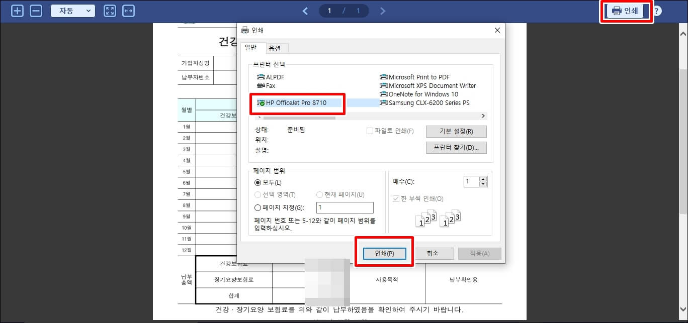 우측 상단에 인쇄를 클릭하시고 집에 설치된 프린터를 선택하시고 인쇄를 클릭합니다.