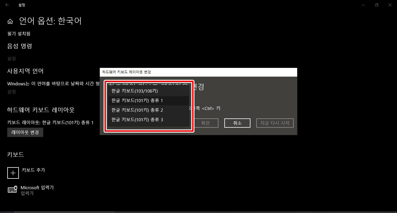 한/영 변환 먹통, 키보드 종류 변경, 101/103/106키 변경, 한영키/한자키 먹통, 키보드 한영 전환 문