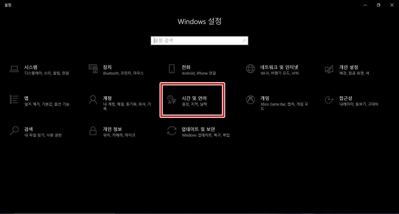 위 3가지 방법으로 해서 안된다고 하면 이제부터는 컴퓨터에 있는 설정 몇 가지를 바꿔봐야 합니다. 그중에서 먼저 레이아웃 설정을 변경해 보도록 하죠. Window+i키를 눌러서 설정창을 띄운 다음 [시간 및 언어] 탭에 접속합니다.