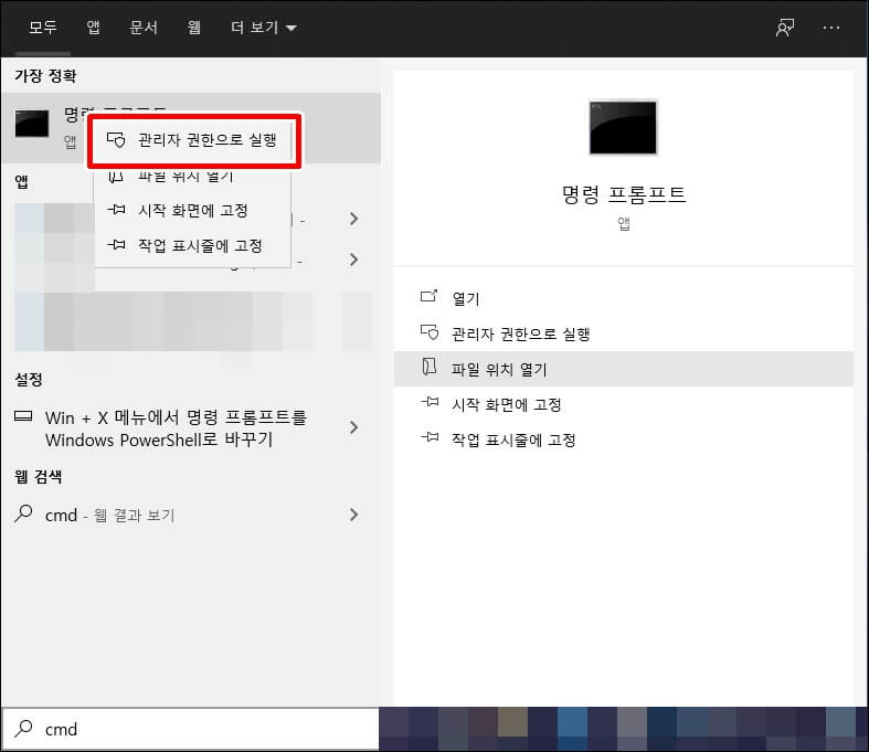 위 방법도 안된다면 이제는 cmd를 관리자 권한으로 실행하여 명령어를 입력해 보도록 하겠습니다. 좌측 아래에서 cmd를 검색하시고 [관리자 권한으로 실행]을 클릭합니다.