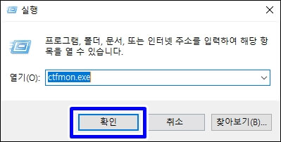 위 방법도 안된다면 다음으로는 실행창과 레지스트리의 설정을 만져볼 차례입니다. 먼저 실행창을 띄우시고 실행창 검색창에 ctrmon.exe를 입력하고 확인을 눌러봅니다. 이 방법은 윈도 충돌로 인하여 생긴 버그이기 때문에 해당 명령어를 입력하시면 재부팅하는 효과가 있습니다. 해당 방법은 작업표시줄 우측 하단 시스템 트레이 영역에 한영키 도구가 없을 때 사용하시면 됩니다.