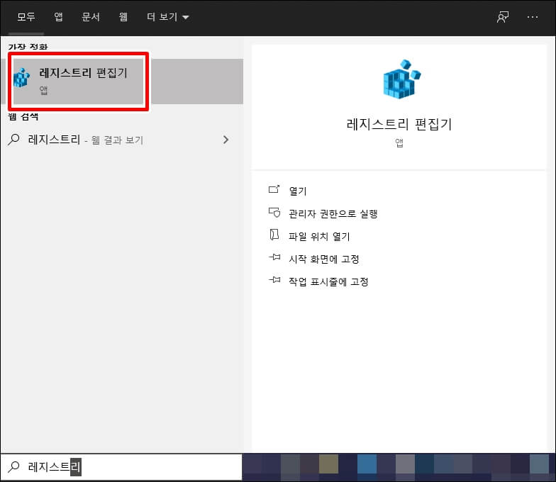 작업표시줄 좌측 아래에서 레지스트리를 검색하신 다음 레지스트리 편집기에 접속합니다.