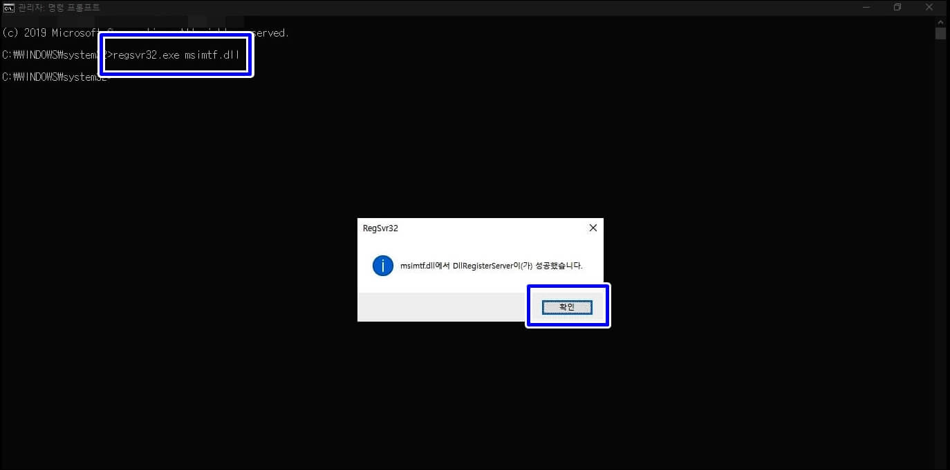 다음에 명령 창에 regsvr32.eve msctf.dll을 입력하시고 엔터를 누르시면 성공했다는 문구가 나오는데요.. 확인을 누르시고 exit 명령어를 한번 더 입력하신 후에 엔터를 누르고 cmd 창을 닫고 재부팅을 해보신 후에 한영키 입력 여부를 확인해봅니다.
