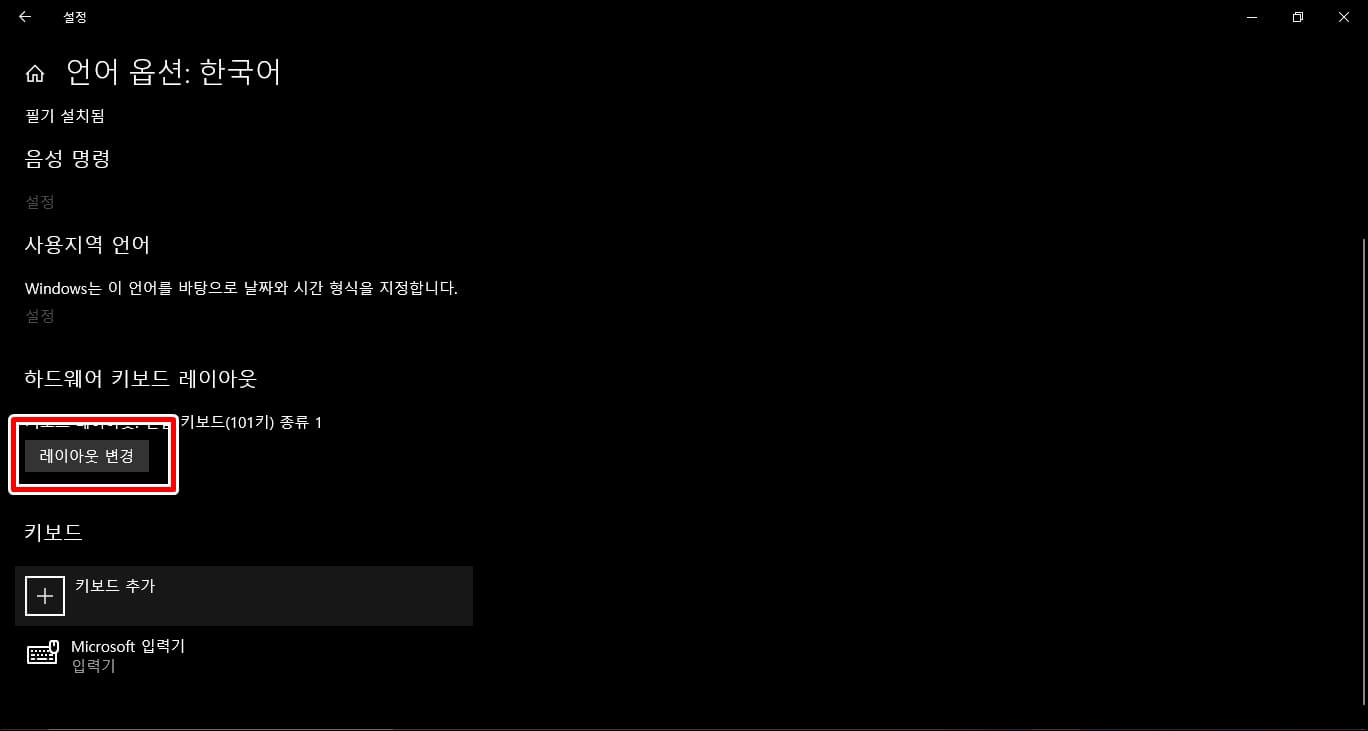 하드웨어 키보드 레이아웃 탭에서 레이아웃 변경을 클릭합니다.