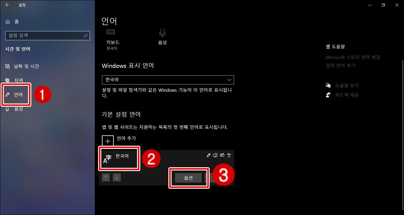 좌측 중간에 언어 탭을 클릭하시고 한국어를 클릭하시면 옵션 탭이 나올 겁니다. 아래 순서대로 클릭하셔서 옵션에 접속해봅니다.