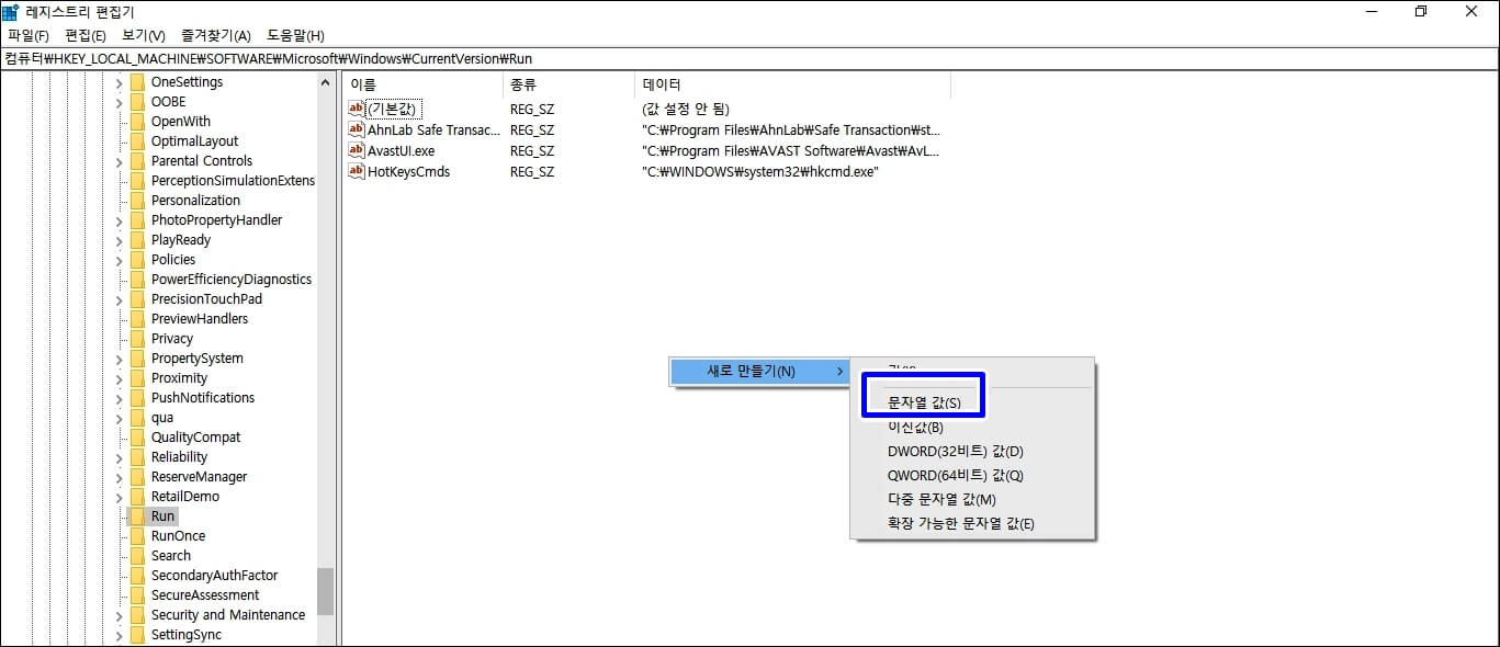 우클릭하셔서 문자열 값을 추가해 줍니다.