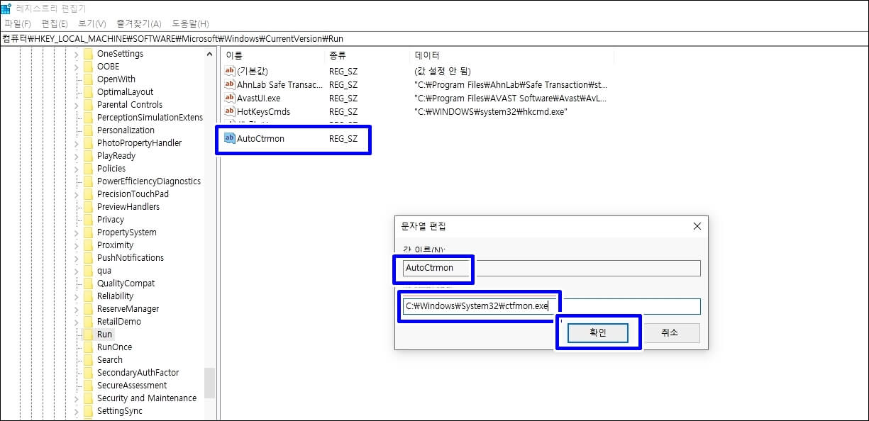 값 이름에 Autoctrmon를 입력하시고 값 데이터에 C:\windows\system32\ctfmon.exe로 변경해 주시고 확인을 클릭합니다.