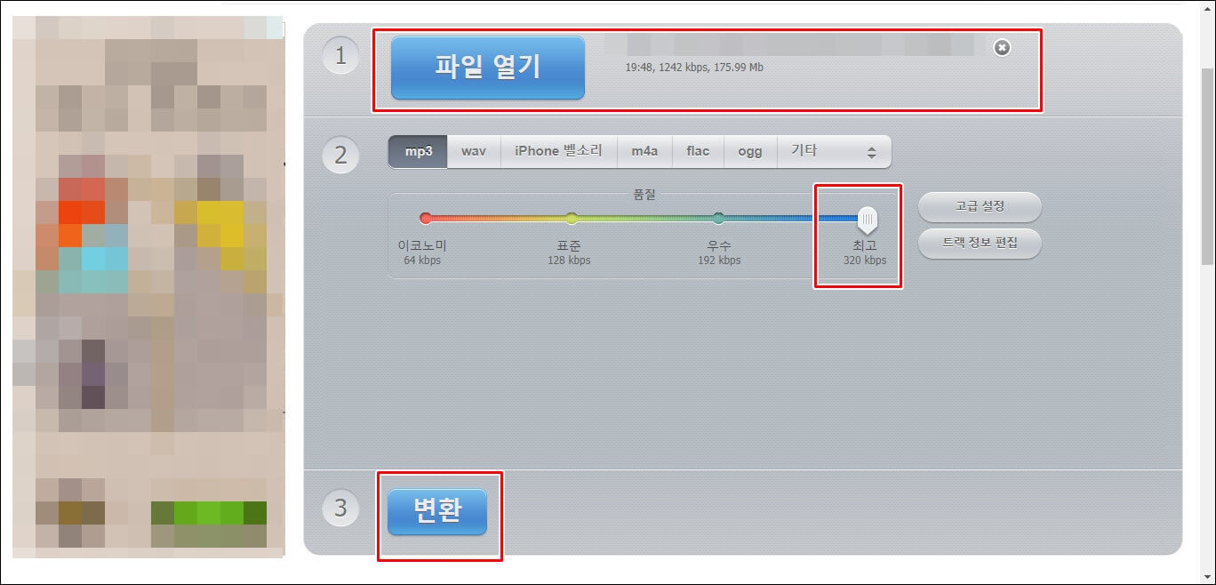 이 포스팅에서 사용할 사이트는 온라인 오디오 변환기라는 이름의 사이트인데요... 변환하는 사이트는 많이 있지만 저는 항상 이곳에서 모든 작업을 진행합니다. 사이트 소개는 변환을 해본 후에 자세히 소개해 드리도록 하겠습니다. 먼저 파일 열기를 눌러서 mp3 파일로 변환할 파일을 선택해 줍니다. 그리고 품질은 320 kbps로 해주시면 됩니다.