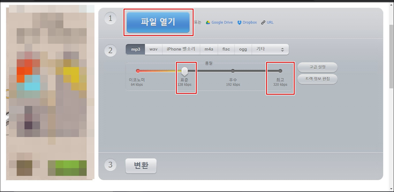 이 포스팅에서 사용할 사이트는 온라인 오디오 변환기라는 이름의 사이트인데요... 변환하는 사이트는 많이 있지만 저는 항상 이곳에서 모든 작업을 진행합니다. 사이트 소개는 변환을 해본 후에 자세히 소개해 드리도록 하겠습니다. 먼저 파일 열기를 눌러서 mp3 파일로 변환할 파일을 선택해 줍니다. 그리고 품질은 320 kbps로 해주시면 됩니다.