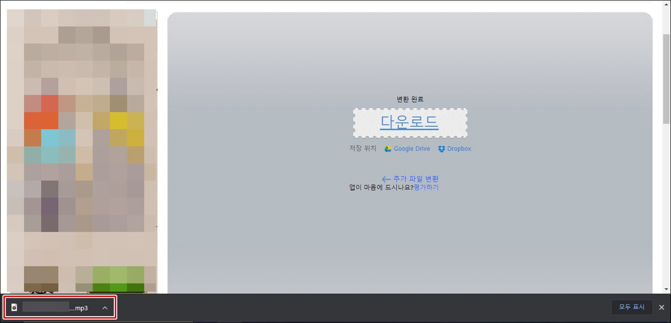 변환이 완료되면 아래와 같이 다운로드 창이 생기는데 바로 다운로드를 할 수 있고 구글 드라이브나 드롭박스에 저장이 가능합니다.