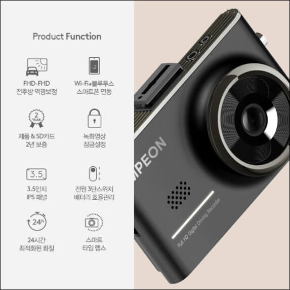그 외에의 기능으로는 메모리 카드의 저장 공간을 최소화하여 장시간 녹화기록을 확보할 수 있는 타임랩스 기능 3.5인치 터치 LCD, 포맷 프리 기능이 탑재되어 있습니다. 또한 저렴한 가격이면서도 전후방 뛰어난 화각을 보여주는데요.. 전방은 150도 후방은 160도로 매우 넓은 화각을 보여주고 있습니다. 가격은 기본 16GB 기준으로 189,000원에 판매가 되고 있습니다.