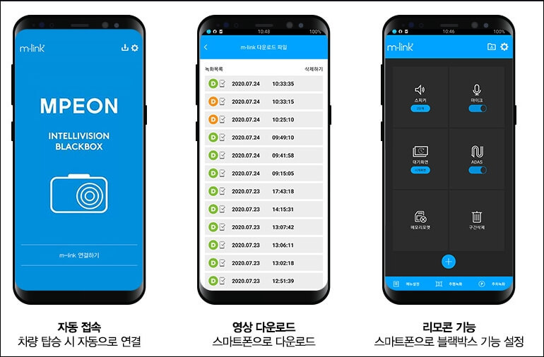 m-link의 기능으로는 차량 탑승 시 자동으로 연결되어 스마트폰으로 영상을 다운로드할 수 있으며 스마트폰으로 블랙박스를 설정할 수 있는 리모컨 기능 주차위치 사진 전송, 자동 업데이트 등 다양한 기능들을 조작할 수 있습니다. 이 제품 또한 오늘 소개한 다른 제품들과 마찬가지로 어느 각도에서나 왜곡 없이 선명한 영상을 확인할 수 있는 3.5인치 IPS 패널과 비밀번호 설정으로 영상을 안전하게 보호하는 시크릿 기능이 탑재되어 있으며 타임랩스 기능과 유사한 스마트 촬영 모드와 ADAS 기능도 탑재되어 있습니다.