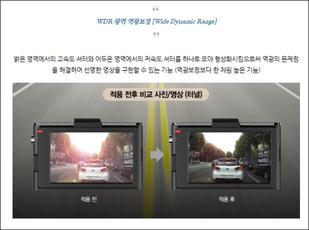 3번째 추천 제품은 엠피온에서 출시되는 MDR-F480인데요. 이 제품 역시 전후방 FULL HD(FHD 1080p, 30 FPS)를 지원하는데요.. 이 제품은 특이하게도 전후방 모두 역광보정 기능이 탑재되어 있는 제품입니다.