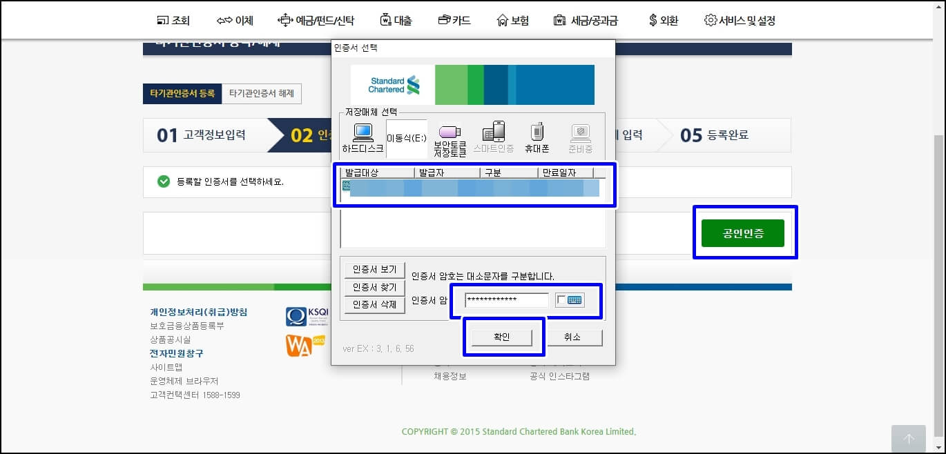 공인인증을 클릭하시고 USB에 있는 공인인증서를 선택하신 다음 인증서 암호를 입력하시고 확인을 클릭합니다.