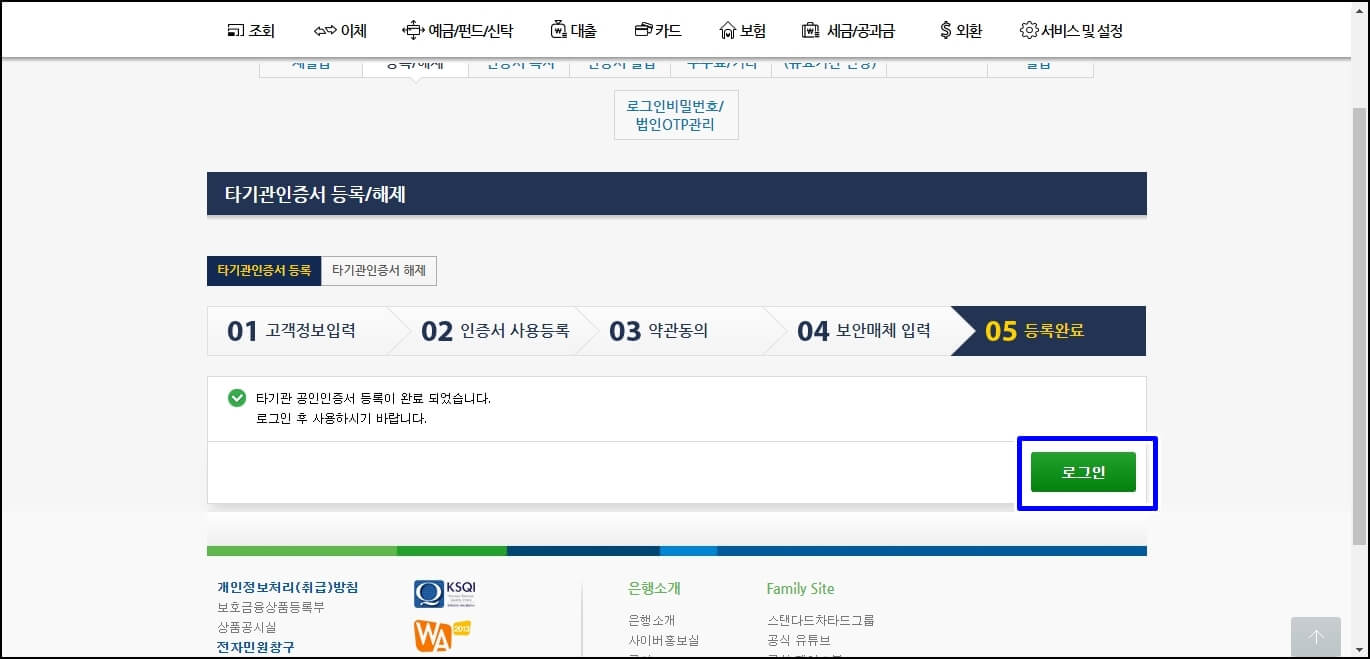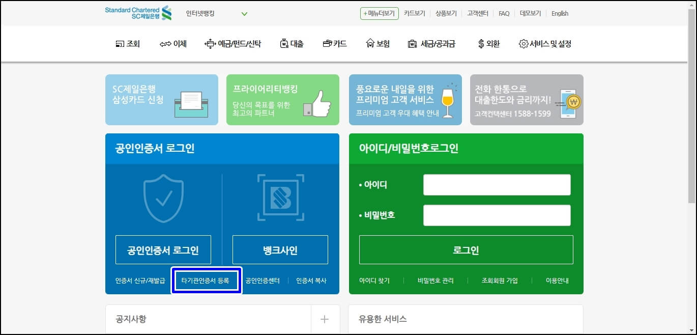저는 타 은행에 공인인증서가 있기 때문에 타기관 인증서 등록으로 공인인증서 등록을 해보도록 하겠습니다. 보안카드만 있으면 인증서 신규/재발급을 통해서 똑같은 절차로 발급받으시면 됩니다.