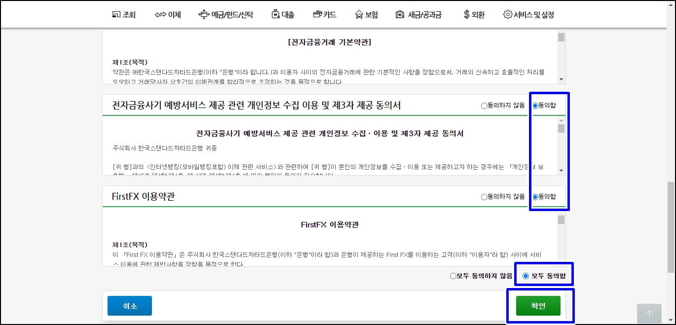 FirstFX, 전자금융, 기본약관 등등 여러 약관에 동의함을 체크하시고 확인을 클릭합니다.
