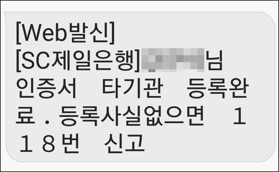 공인인증서를 발급하시면 아래와 같이 스마트폰에 문자가 옵니다. 만일 자신이 등록한 적이 없는데 이런 문자가 오면 신속하게 181번으로 전화를 하셔서 신고해 주시길 바랍니다.