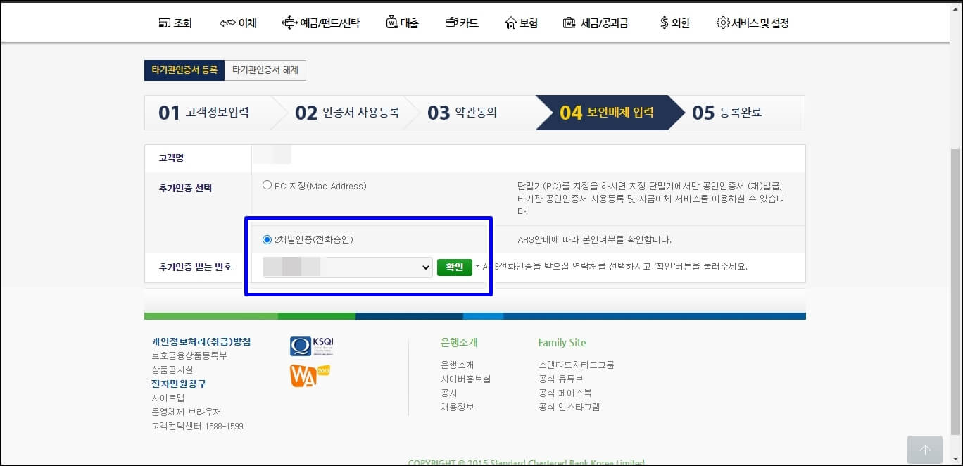절차는 고객정보 입력/인증서 사용 등록/약관 동의/보안매체 입력/등록 완료 등 5단계로 나뉩니다. 그럼 하나씩 해보도록 하겠습니다. 먼저 고객 구분에 개인과 법인을 구분해 주시고 주민등록번호를 입력하신 다음 확인을 클릭합니다.