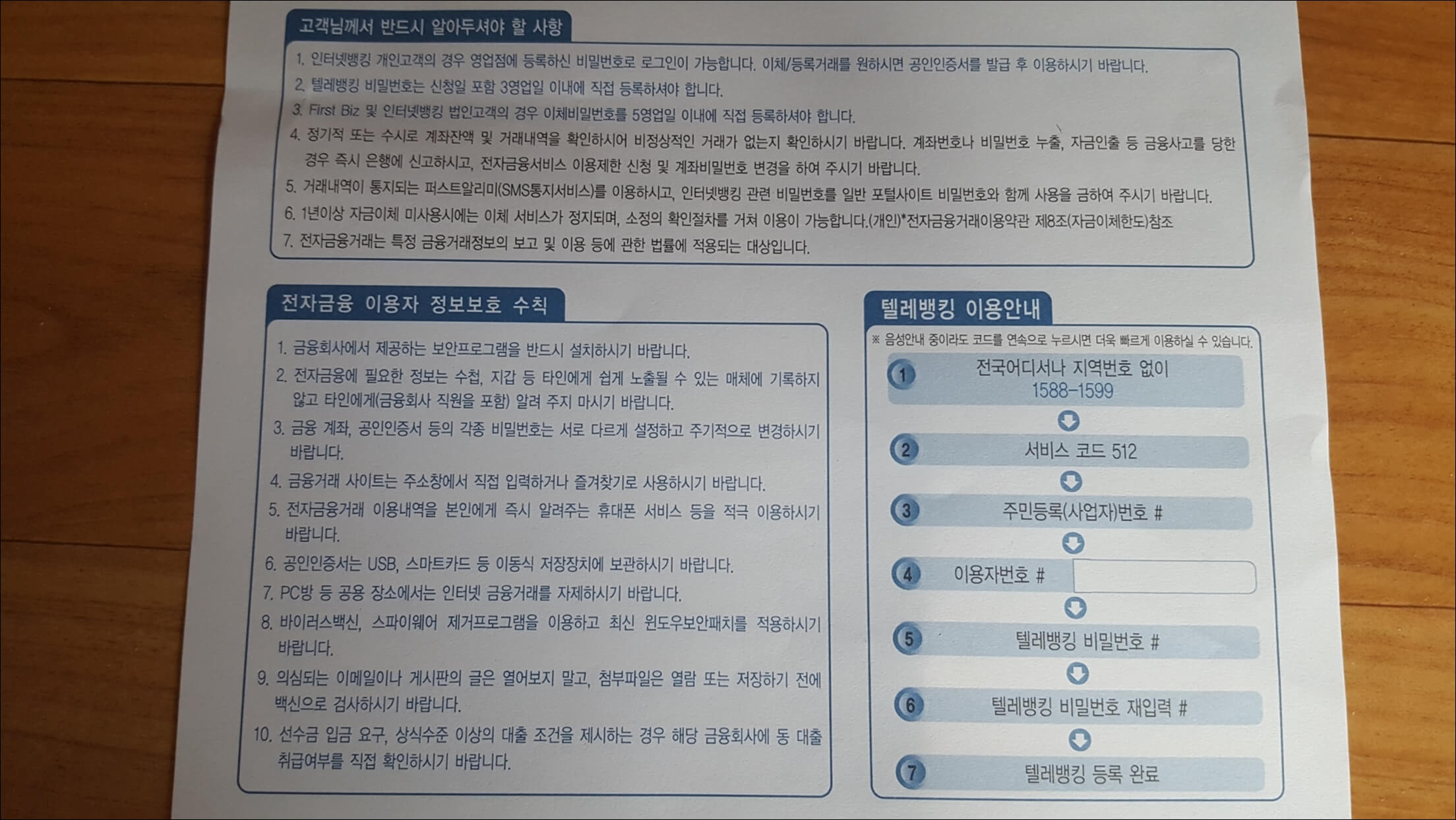 자 그럼 발급받은 안내문을 좀 살펴보도록 하죠. 여기서는 인터넷 뱅킹 업무와 관련된 정보들이 앞뒤로 잘 설명되어 있는데요. 고객님께서 반드시 알아두셔야 할 사항, 전자금융 이용자 정보보호 수칙, 텔레뱅킹 이용안내가 잘 나와있으니 읽어보시길 바랍니다.