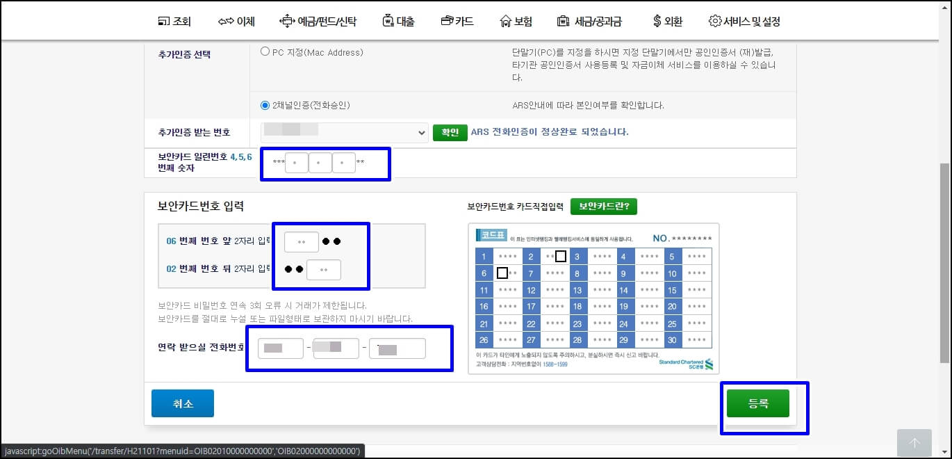 다음으로 보안카드의 일련번호 4, 5, 6번째 숫자를 입력해 주시고, 보안카드 숫자에 랜덤으로 부여되는 각종 숫자를 입력해 주신 다음 연락받으신 전화번호를 입력해 주시고 등록을 클릭하시고 됩니다.