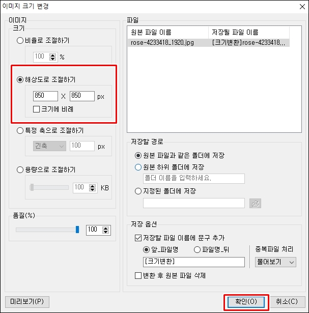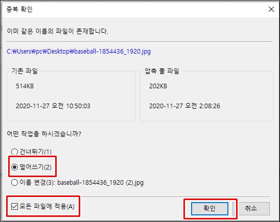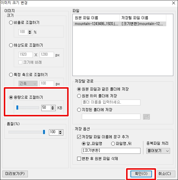 덮어쓰기를 체크하시고 모든 파일에 적용을 선택하신 다음확 인을 클릭하시면 사진 용량 줄이는 과정이 끝이 납니다.