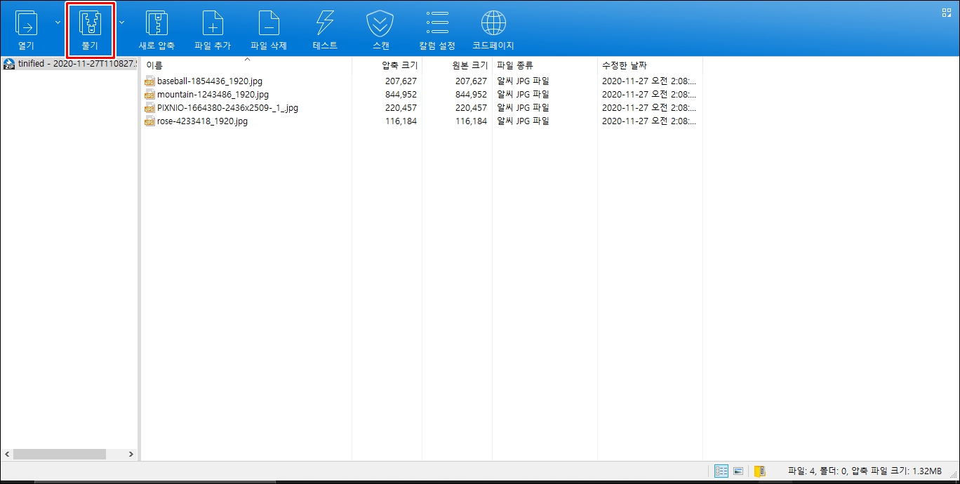 여기서 좌측 상단에 풀기 탭을 클릭합니다.