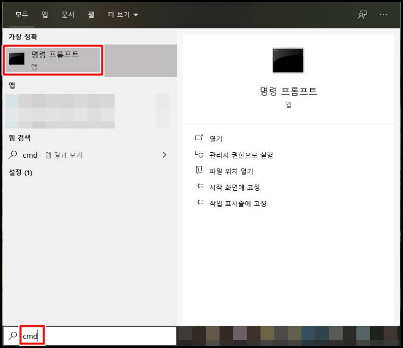 시리얼 넘버를 확인하려면 cmd 명령 프롬프트를 활용하여 조회를 할 수 있습니다. 바탕화면 좌측 아래 검색창에서 cmd를 검색하셔서 명령 프롬프트에 접속합니다.